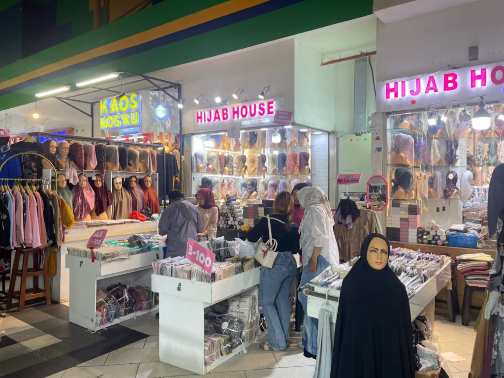 Jika Anda melipir ke lorong-lorong yang lebih spesifik, misalnya di area aksesoris dan hijab, suasana akan terasa lebih intim namun tetap padat. Cahaya lampu neon dari papan nama toko seperti “Hijab House” memantul di atas deretan manekin yang memamerkan koleksi kerudung terbaru. Di sini, pengunjung tidak hanya melihat baju, tapi menyempurnakan penampilan mereka dengan pilihan hijab yang serasi.